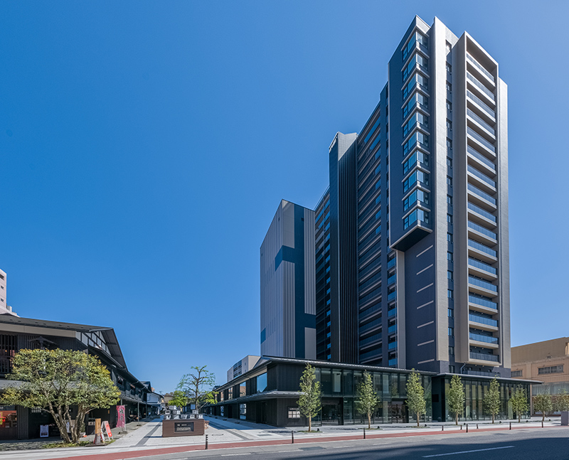 七日町は古くから街の中心地として機能してきており、風情ある風景が今も残る伝統的な街です。建物は、それらの歴史と風景と調和させるために伝統色を用いた外観デザインが特徴で、低層部は隣接の観光名所である御殿堰と一体的な景観をつくりました。