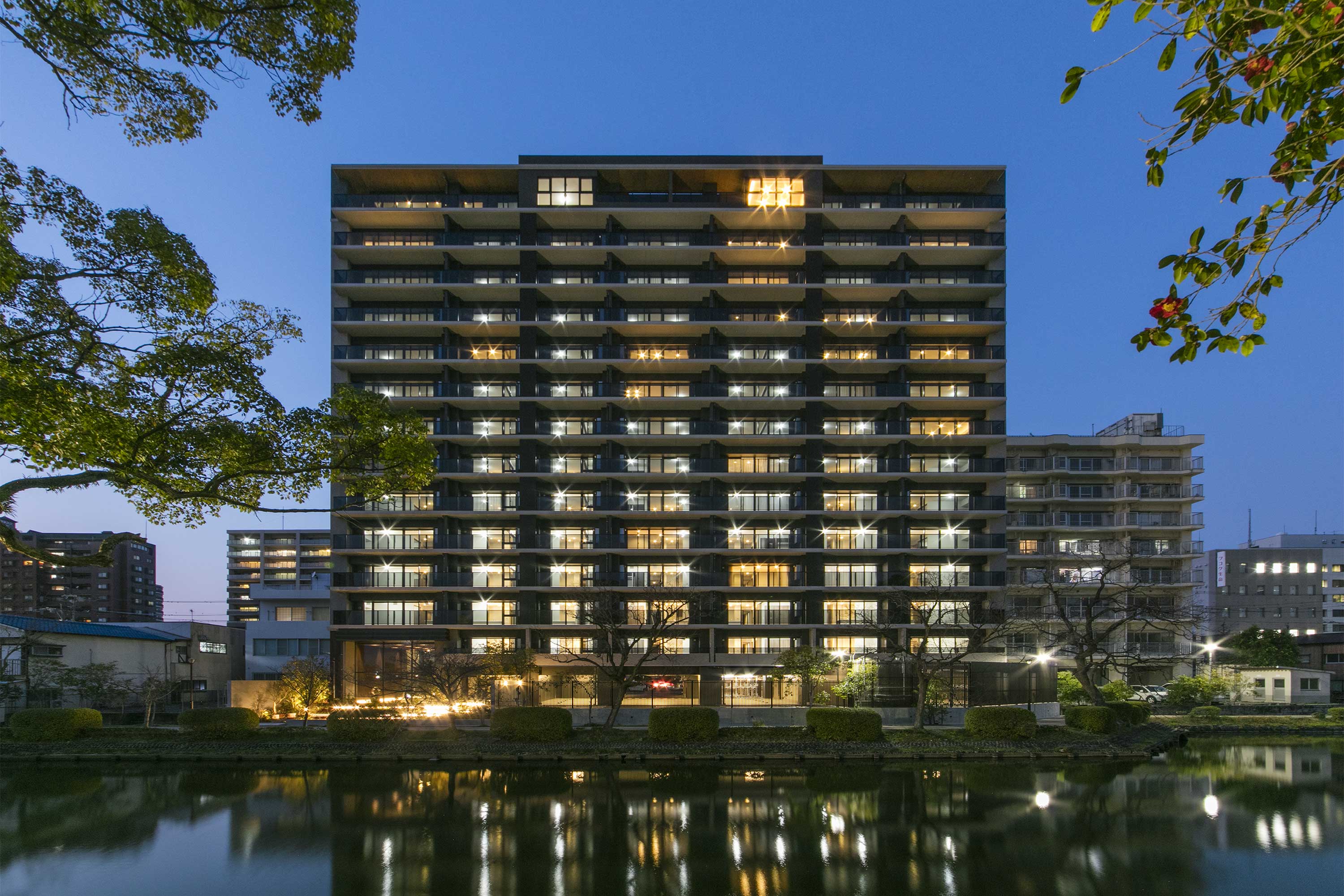 今回の「デュオヒルズ城内」は、佐賀県佐賀市の中心部に位置する佐賀城公園のお濠に面した、非常に希少な立地の物件です。由緒あるこの土地で、街やお濠の景観と調和する建物とすること、そしてここで暮らす住民の皆様がその景色や空間を十分に享受できることに、私たちは知恵を絞りました。