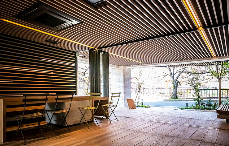 マンション1階のラウンジはフルオープンにすると、外のテラスと接続することができます。