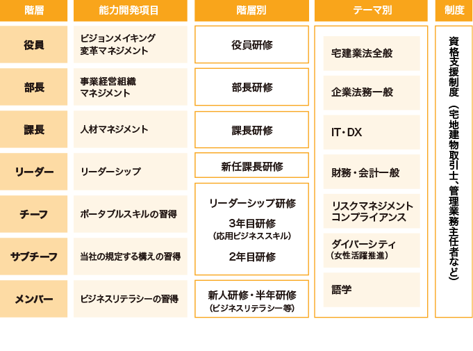 当社グループは、欲しかった暮らしの追求および中長期的な企業価値の向上に向けて、従業員の能力開発や、多様な視点・価値観を養う人材育成の推進が重要と考えています。そのため、各従業員のステージに応じた階層別研修やテーマ別研修、能力向上に向けた資格取得の支援制度を整備し、キャリア開発支援を行っています。