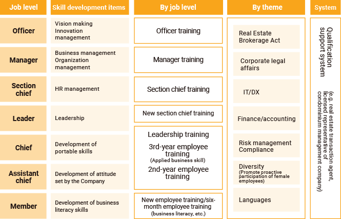 The Group believes developing employees’ skills and promoting talent development to cultivate diverse perspectives and sense of values are crucial in pursuing “dream life” and increasing mid- to long-term corporate value. Accordingly, as part of our career development support, we provide trainings by job level and theme based on the stage of individual employees as well as a qualification acquisition support system aimed at improving skills.