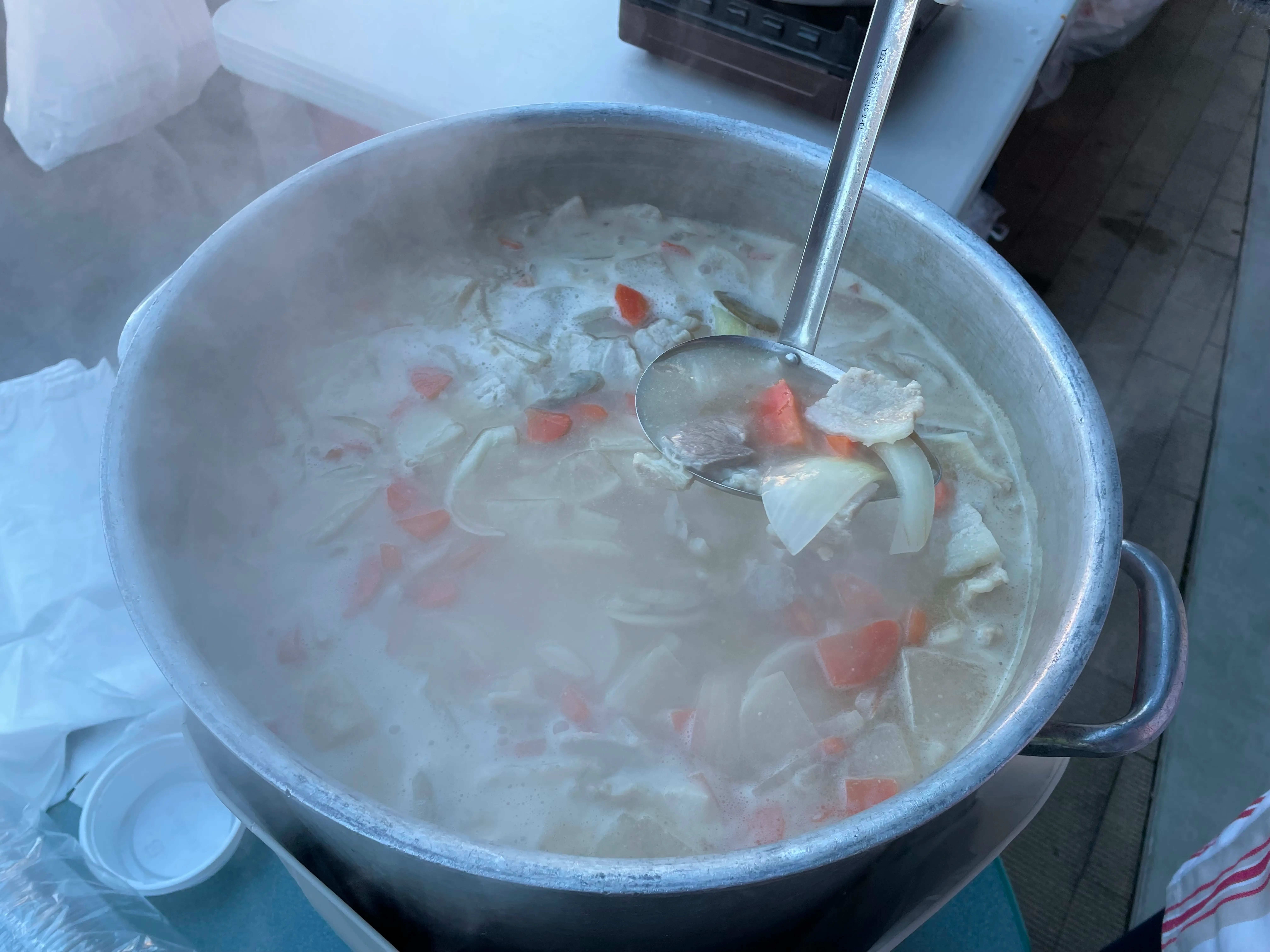 お手伝いにもたくさんの方が参加し、協力してお餅の配布や炊き出しを行います。寒い中での温かい豚汁、嬉しいですね!お年玉抽選会があった年もありました。