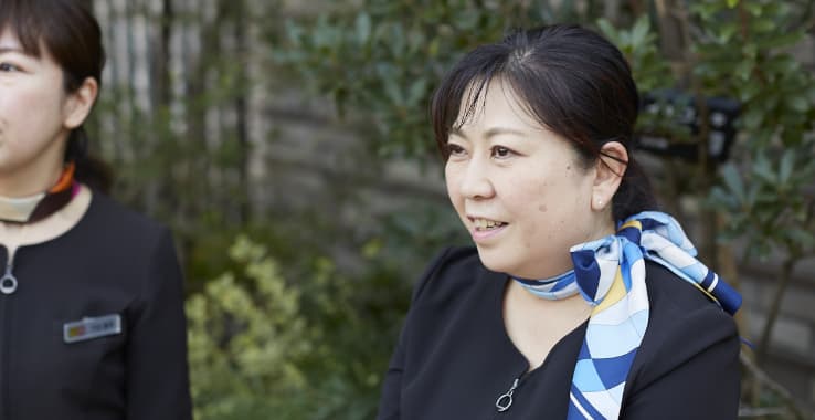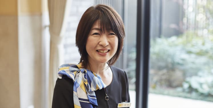 介護の資格はないが、シニアの方のために何か力になれればいいなと、銀行の事務センターでの口座振替業務から一転、コンシェルジュになった村松みゆきさん。社員とパートの垣根なく、事困ったことがあってもみんなで相談していけるチームワークの良さこそ自慢。